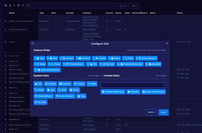 Instead of the checkbox-style column selector from Classic, grid configuration is now managed through the gear icon in the upper-left corner of the page. Grid configurations are per user. Any changes you make will only affect your own view.