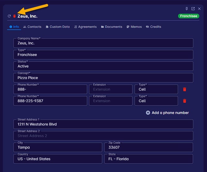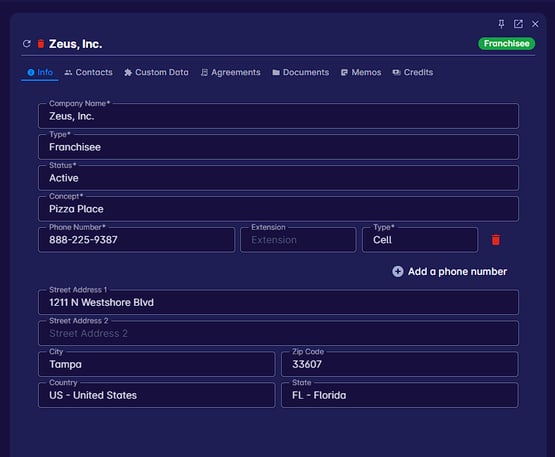 The Info tab contains basic company details, including Name, Type, Status, Concept, Address and Phone Number.