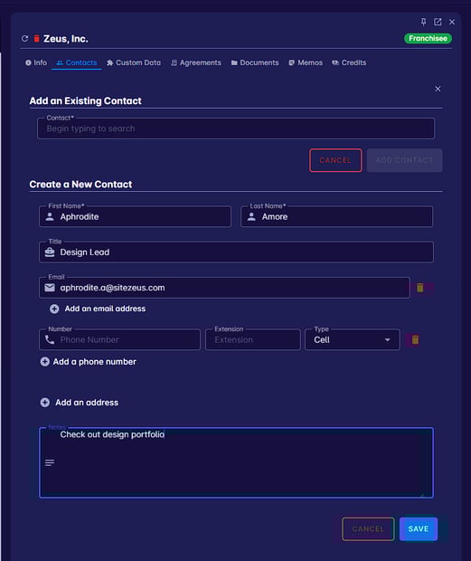 When adding a contact, you can either search for an existing contact or create a new contact directly from this form.