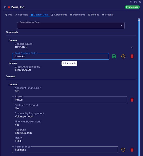 The Custom Data tab displays all Custom Fields associated with Companies.