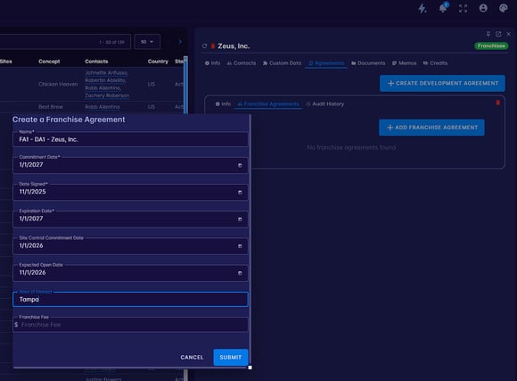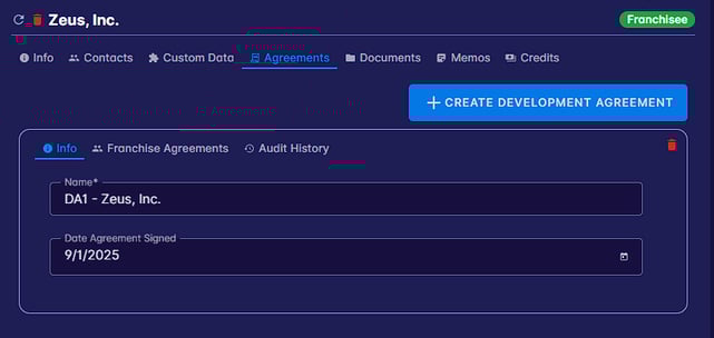 The Agreements tab manages both Development Agreements and Franchise Agreements for a company. Associating Companies or Franchise Agreements to Sites is optional and intended for reporting and data tracking purposes only.