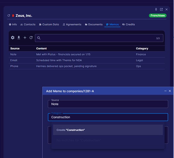 The Memos tab allows you to create and manage company-specific notes and communications.