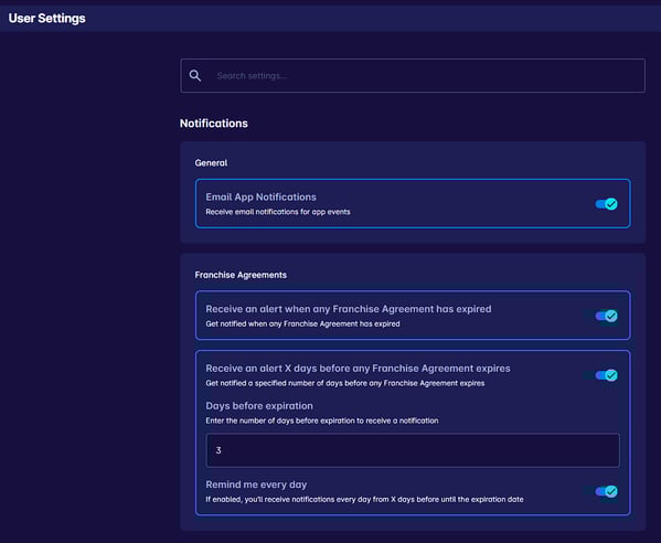 Users with the appropriate permissions can opt into Franchise Agreement Expiration notifications.