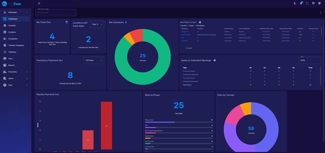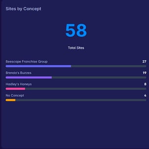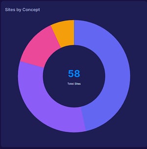 The Sites by Concept widget displays a donut-style or bar chart showing site distribution by concept.