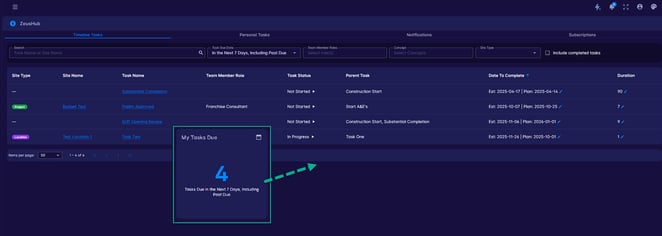 Clicking the number in the widget takes you to the Timeline Tasks tab in the ZeusHub, filtered by the selected date range