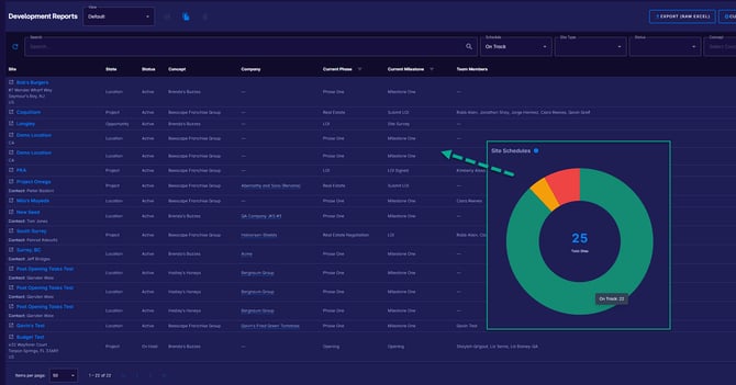Clicking any colored segment takes you a filtered Development Report View by schedule status