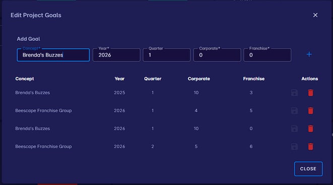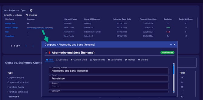 These goals are automatically compared against estimated opening dates, allowing you to see how projected timelines align with organizational targets.