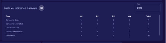 The Goals vs Estimated Openings widget allows users with select permissions to define and track opening goals.