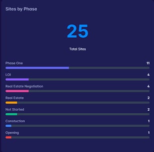 The Site Schedules widget provides a snapshot of how site timelines are tracking compared to planned completion or opening dates.
