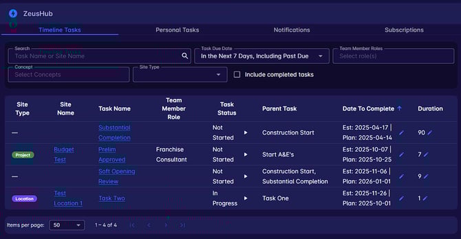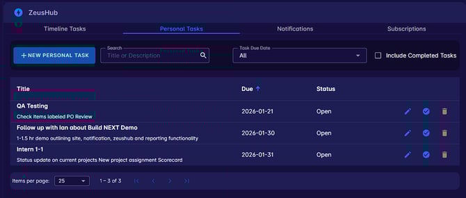 The ZeusHub provides a centralized place for users to manage tasks and stay on top of work that requires action—whether those tasks are tied to site timelines or are personal reminders.