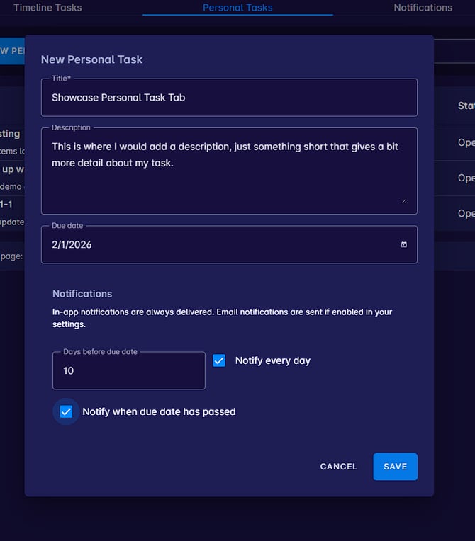 When creating or editing a Personal Task, users can choose to receive notifications:
